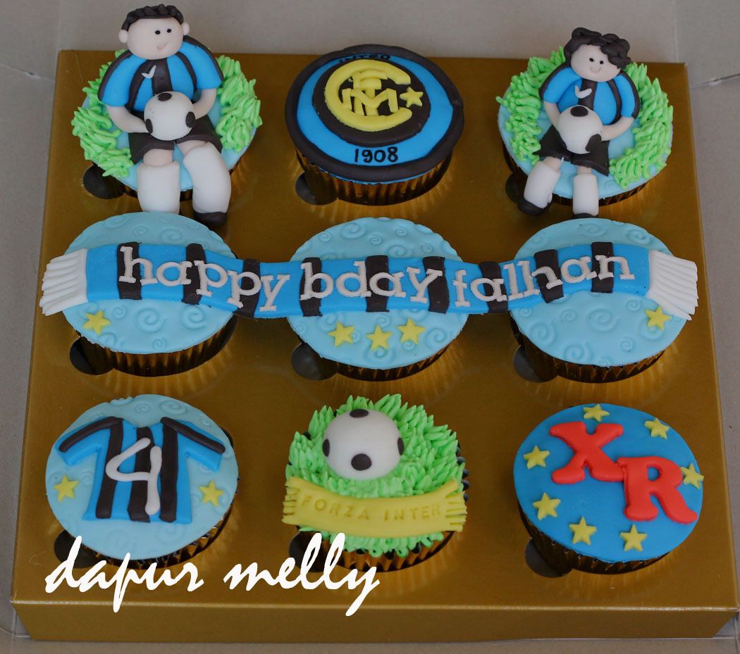 cupcake ini diorder sarah di jakarta buat falhan di bogor..bertema bola dan klub intermilan...ada bola tentunya, kaos intermilan, lambang intermilan...